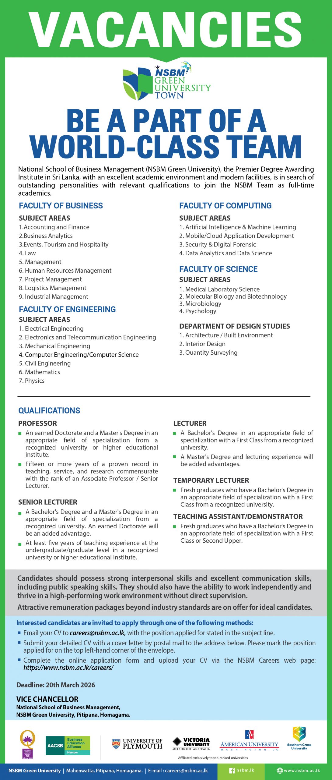 Careers at NSBM Green University We at NSBM are constantly on the lookout for dynamic individuals with that extra spark to join our team of academic and administrative/marketing staff. If you’ve got what it takes, watch this space for updates on our latest vacancies! Vacancies : Academic Staff Vacancies : Academic Staff Full Name Contact Number Email Position Applying Upload CV